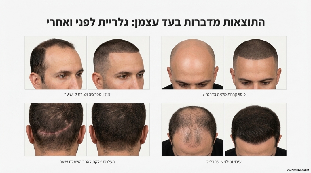 תמונות לפני: השתלת שיער תוצאה. תמונות אחרי: השחרת/הדמיית/הצללת שיער